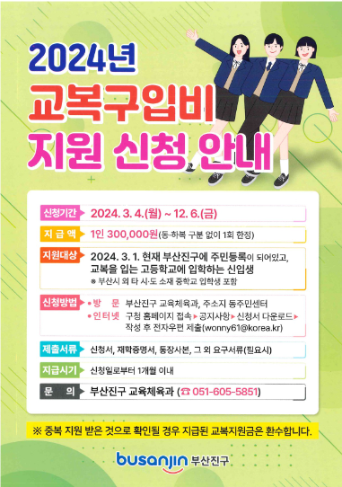 2024년에 부산시에서는 부산시에 거주하는 중, 고등학생을 대상으로 교복구입비 30만 원을 지원합니다. 부산 교복지원금은 각 지역자치구마다 신청기간과 신청방법이 차이가 있으니, 아래 포스팅에서 해당 지역구 내용을 잘 확인하시고 신청하시길 바랍니다.